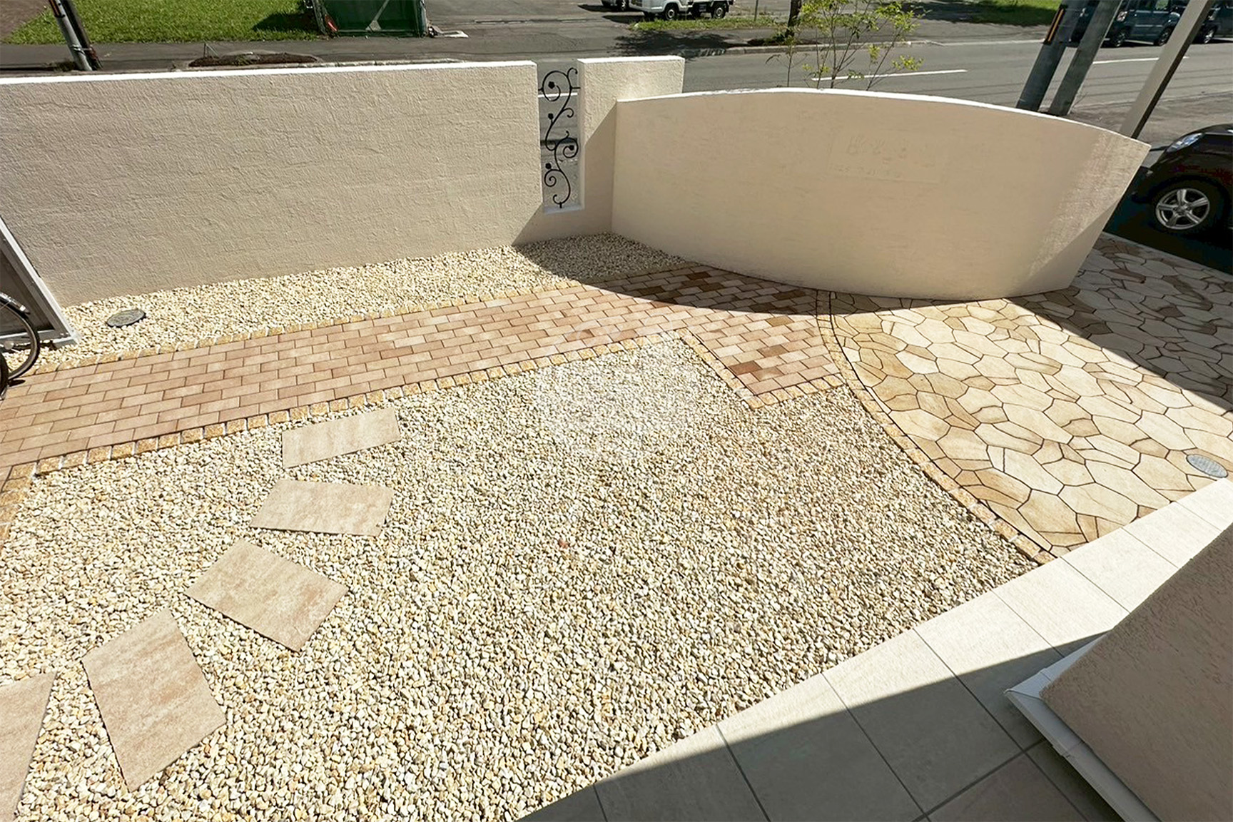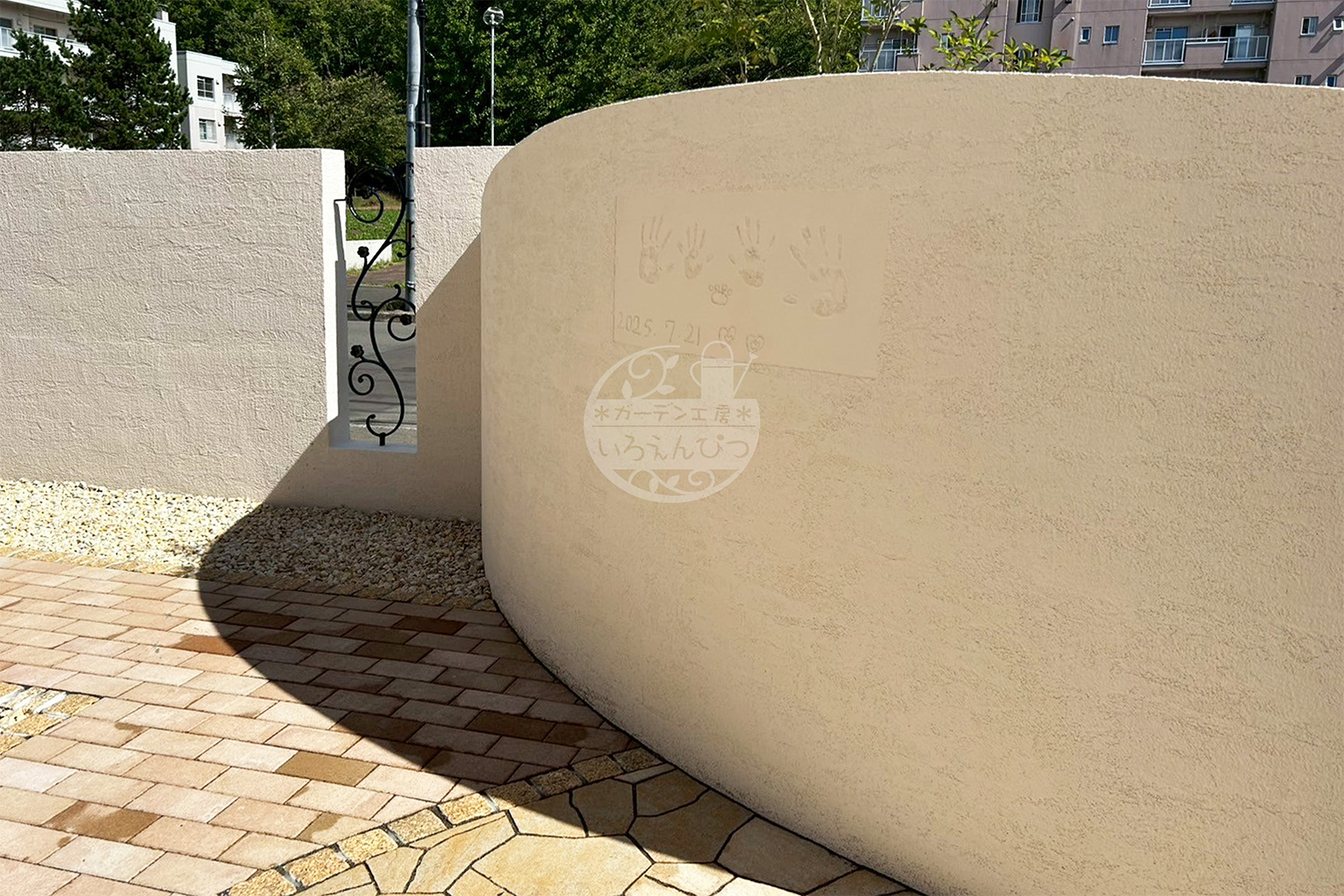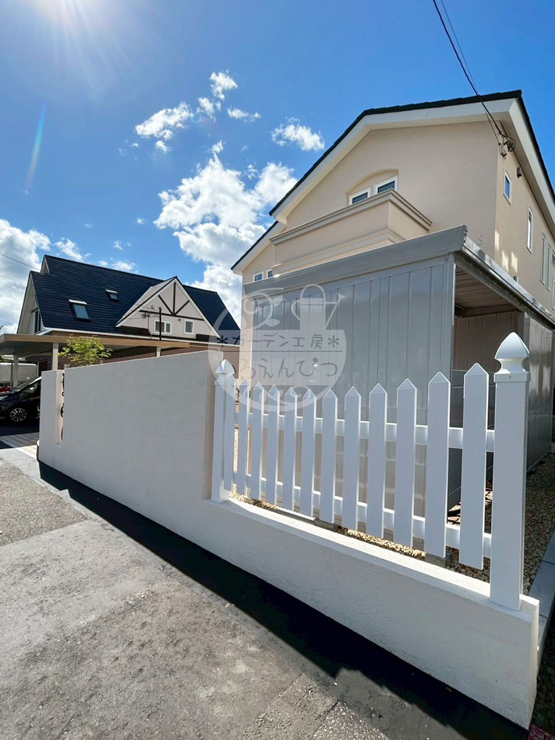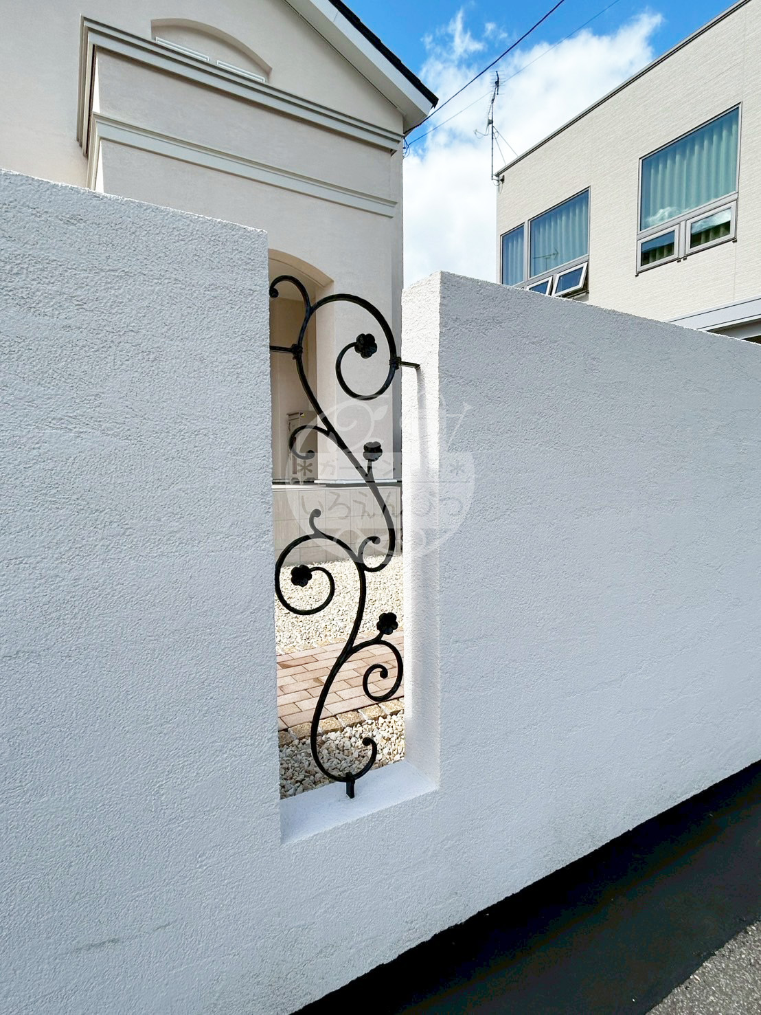 四国化成さんの「パレット」というきめの細かい塗料を使用し、ところどころではアールフィックスという鋳物製品(ディーズガーデンさん)やロイヤルフェンス(タカショーさん)も使い抜け感も出しています。