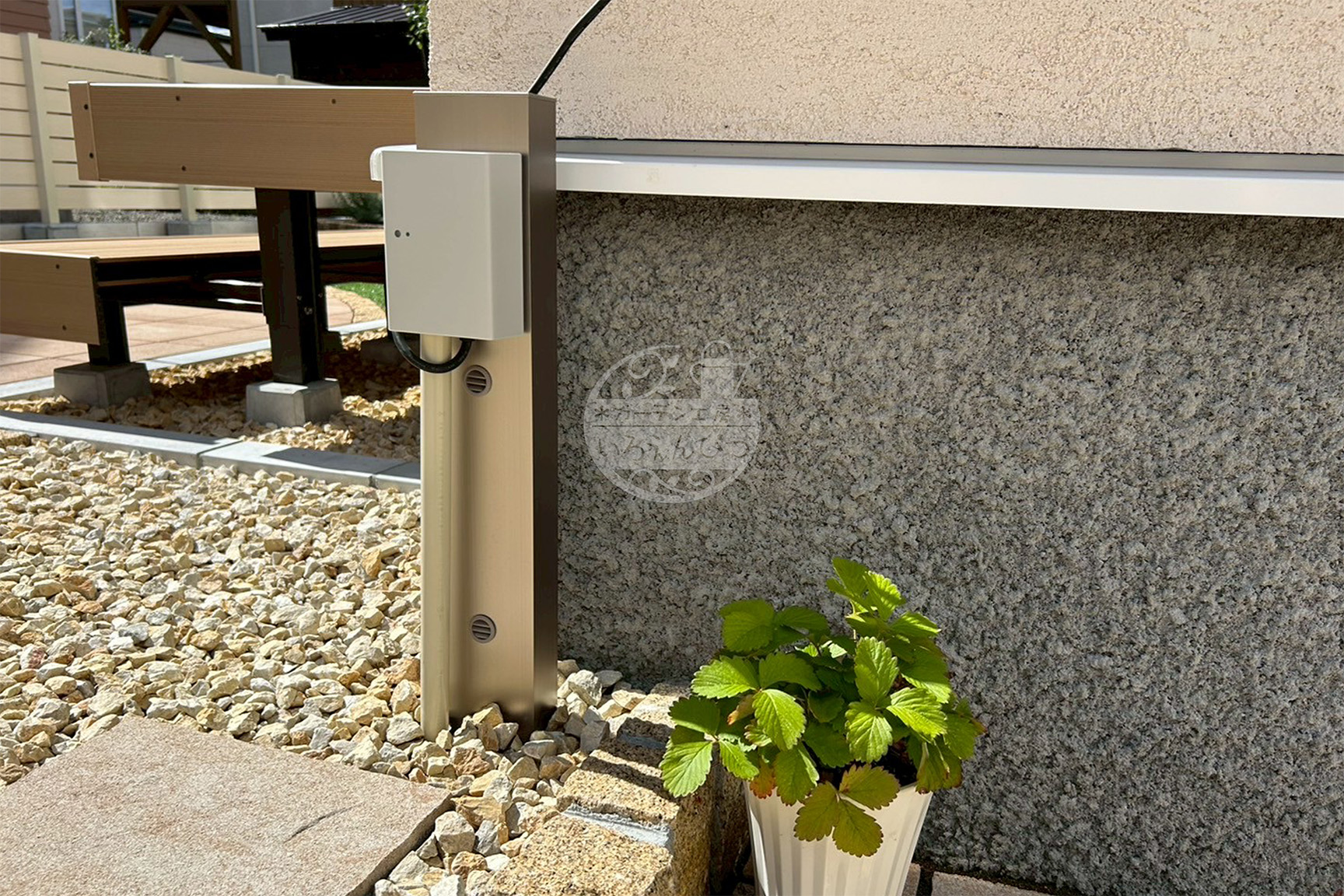 階段横には、ご新築のご住宅を傷つけないよう、電気の変圧器を専用の小さな柱を使用して取り付けています。