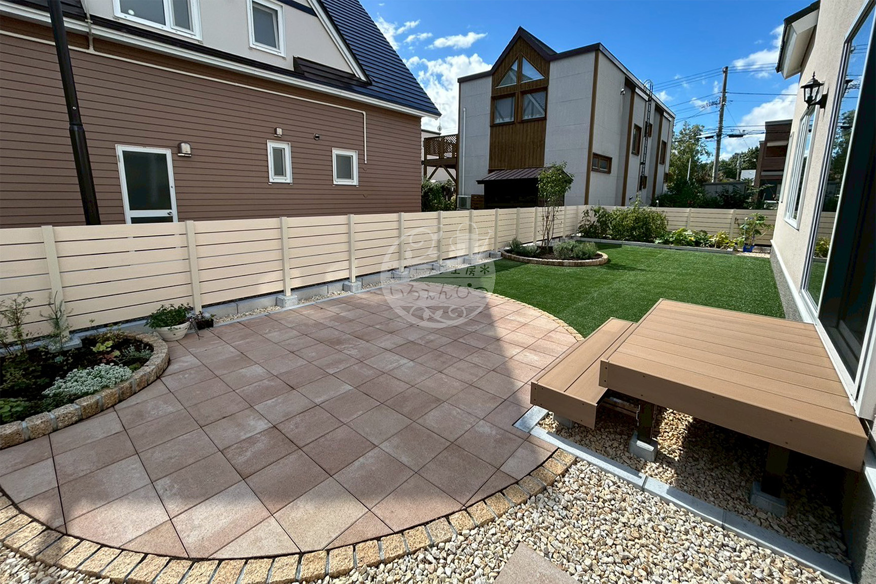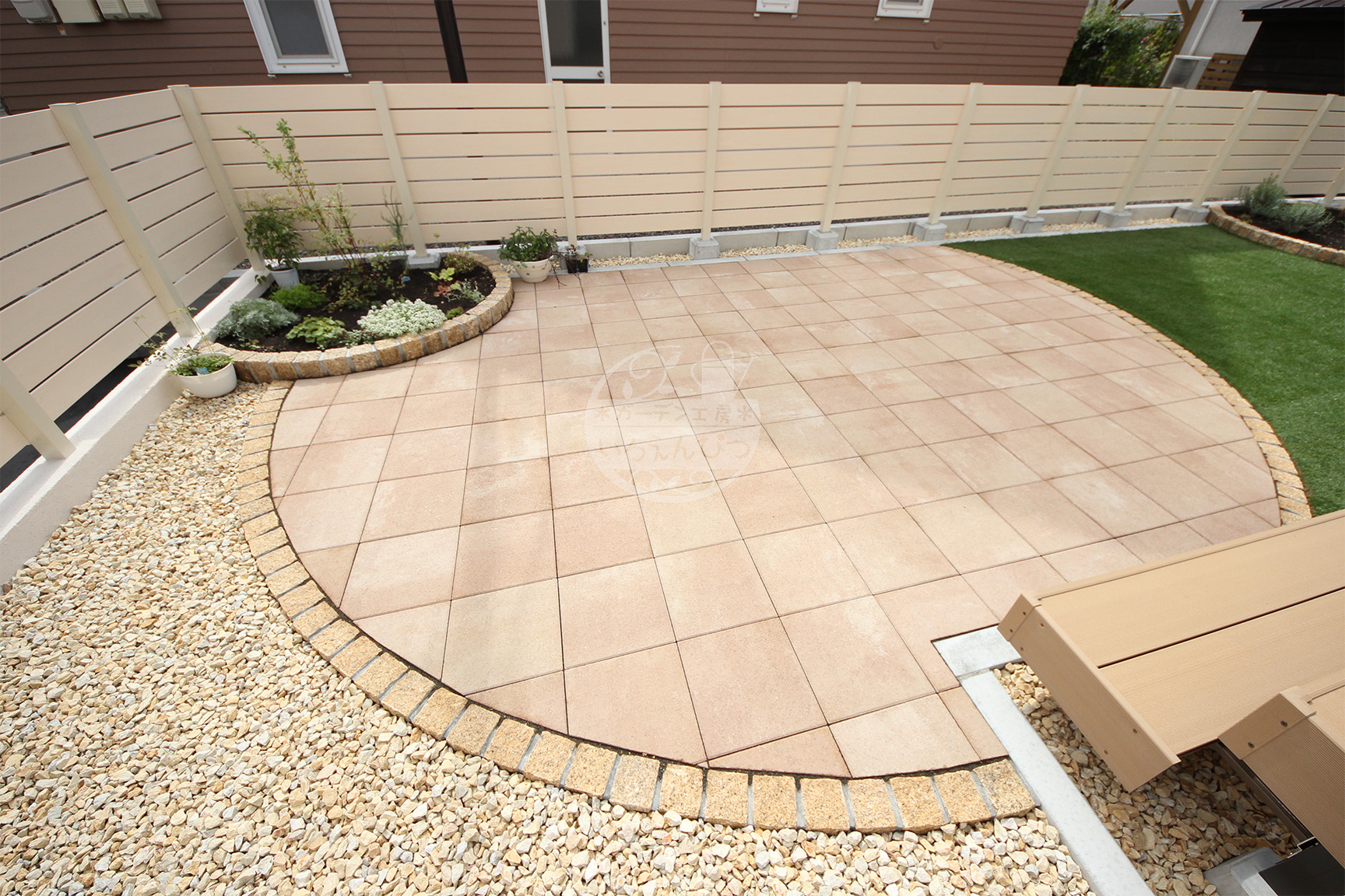 ウッドデッキからつながるサークル状のインターロッキングブロックでおつくりしたフロアには、高さを変えた花壇も併せました。