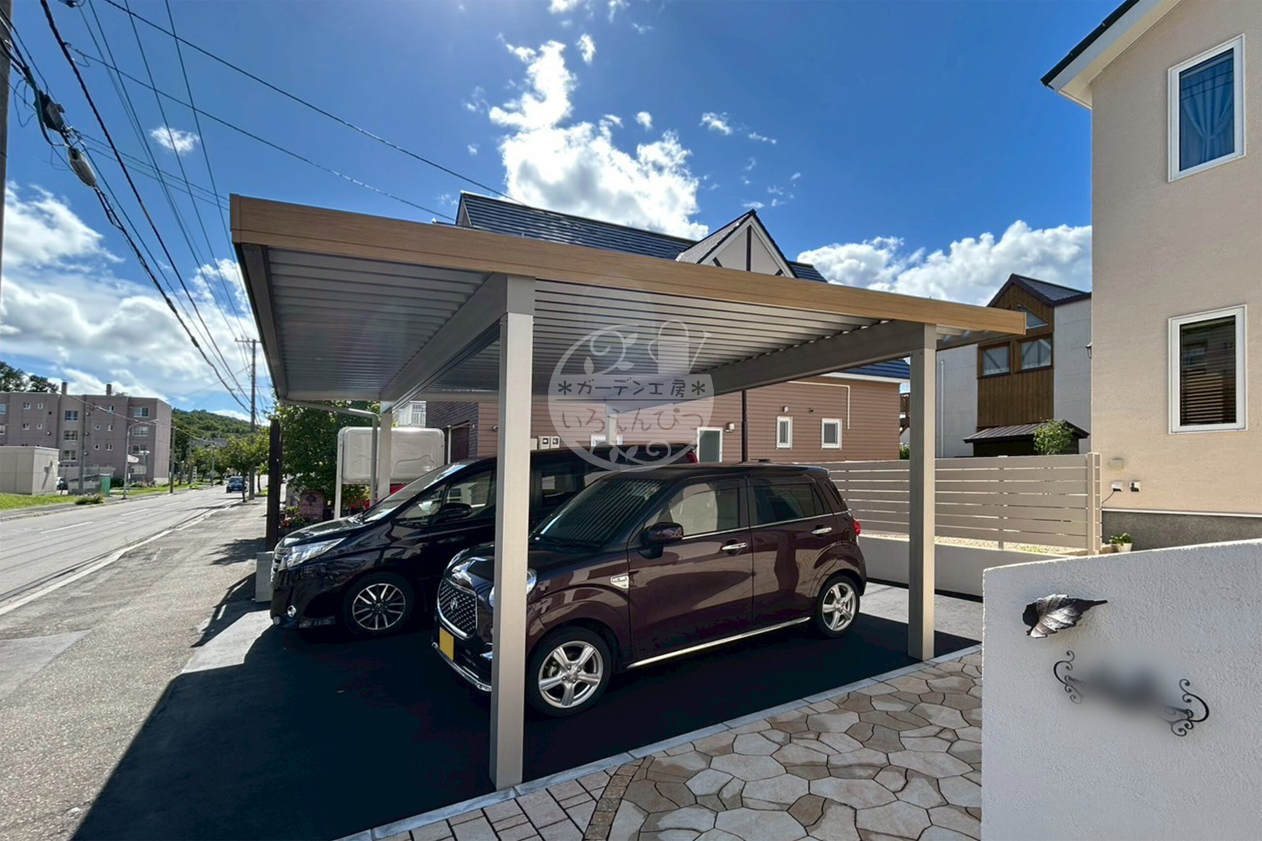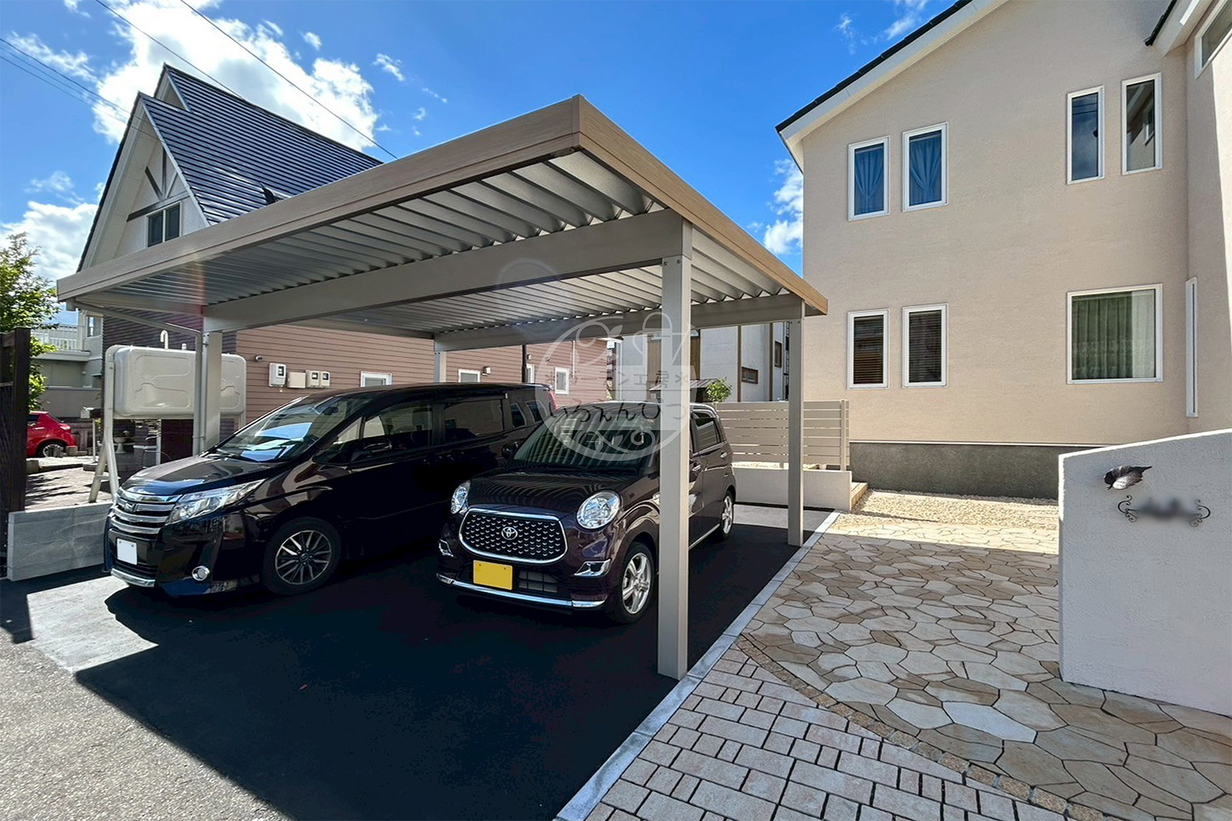 お庭の色味に合わせながらもアクセントとなる素敵なカースペースとなりました。