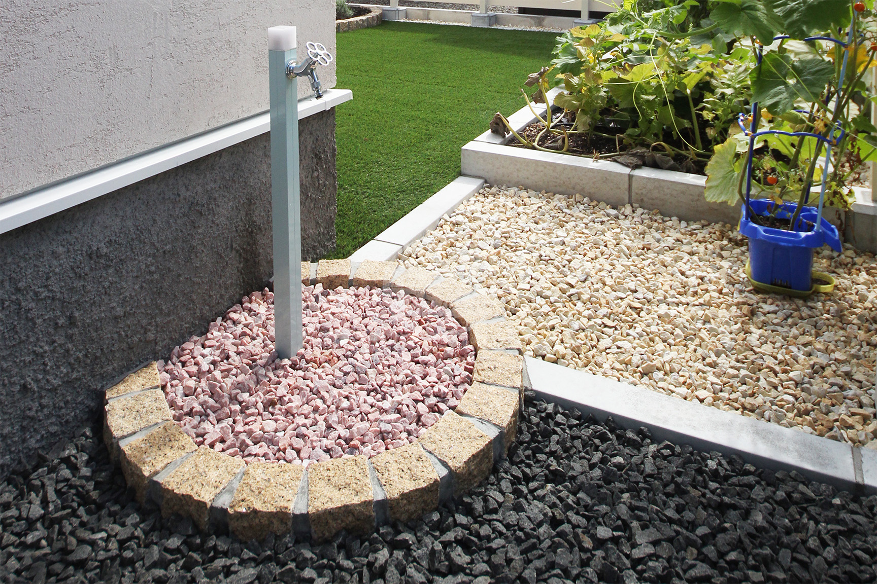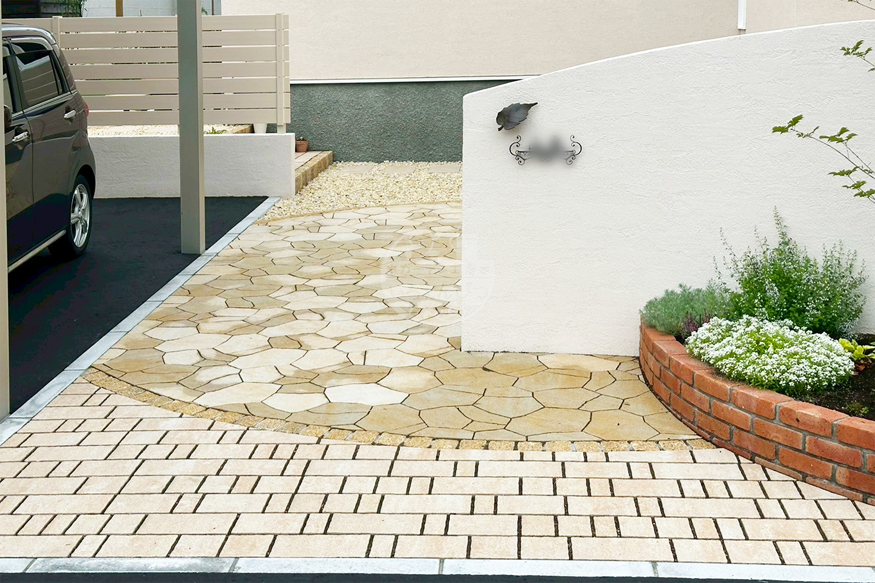 インターロッキングというコンクリート製品もアプローチや物置への動線とお庭で使用しています。