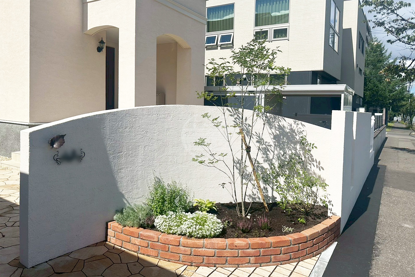 こちらのレンガで作った花壇には弊社でアオダモを植えさせていただきました。