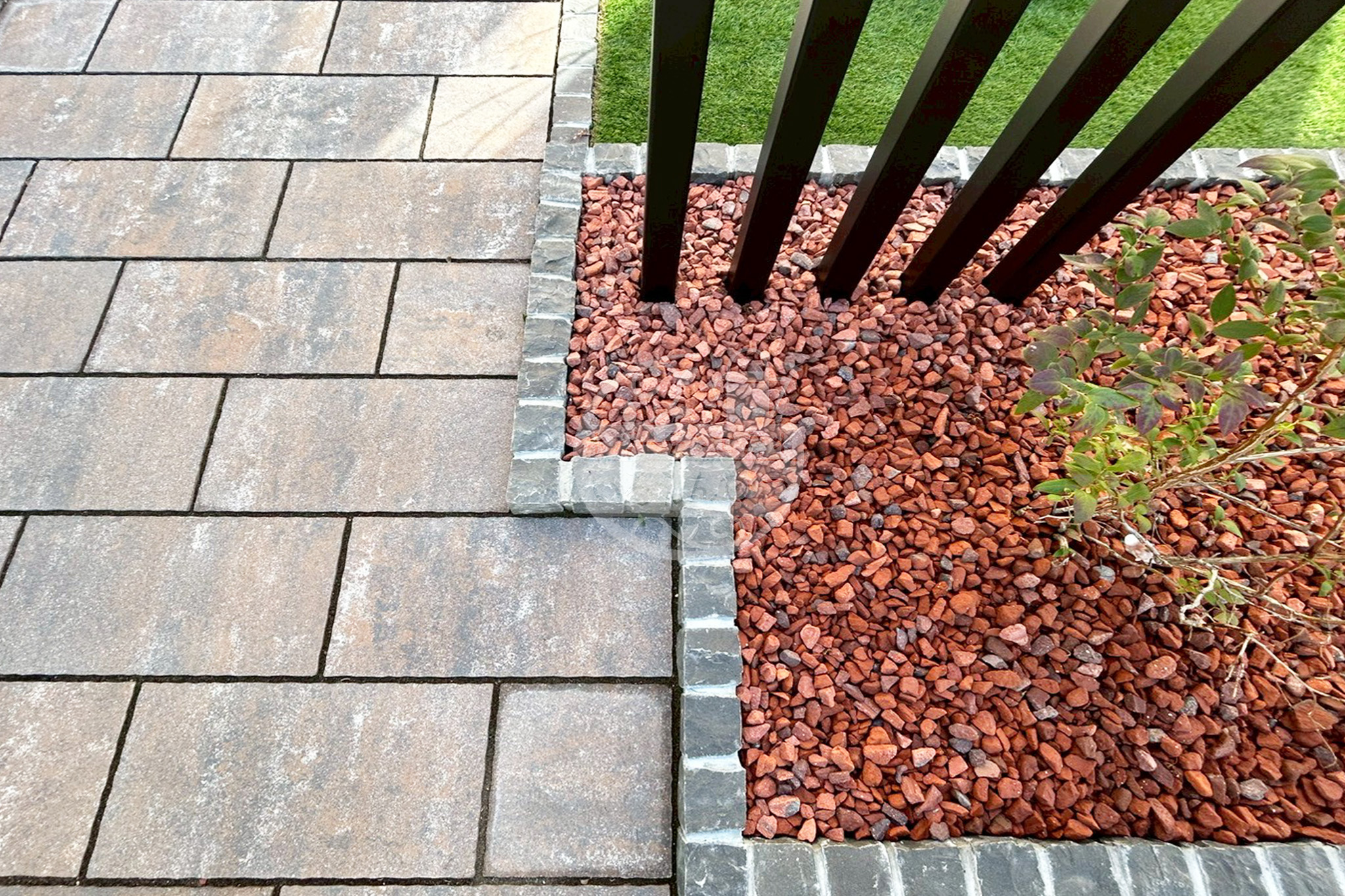 庭スペースには、花壇枠含めピンコロブラックという天然石を仕切りとして大量に使わせていただきました。