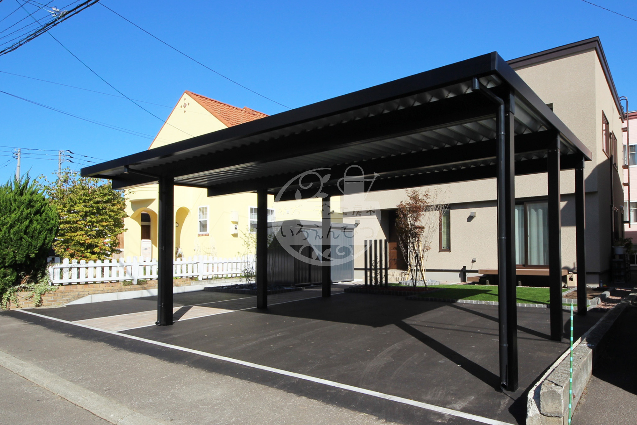 札幌でも最近は4本柱カーポートが主流となってきていますが、こちらは2台用ワイドサイズという横幅である上、駐車スペースとは別に張り出した幅1.8mの屋根部分が設けられている特別な屋根広さのため、6本柱となっています。