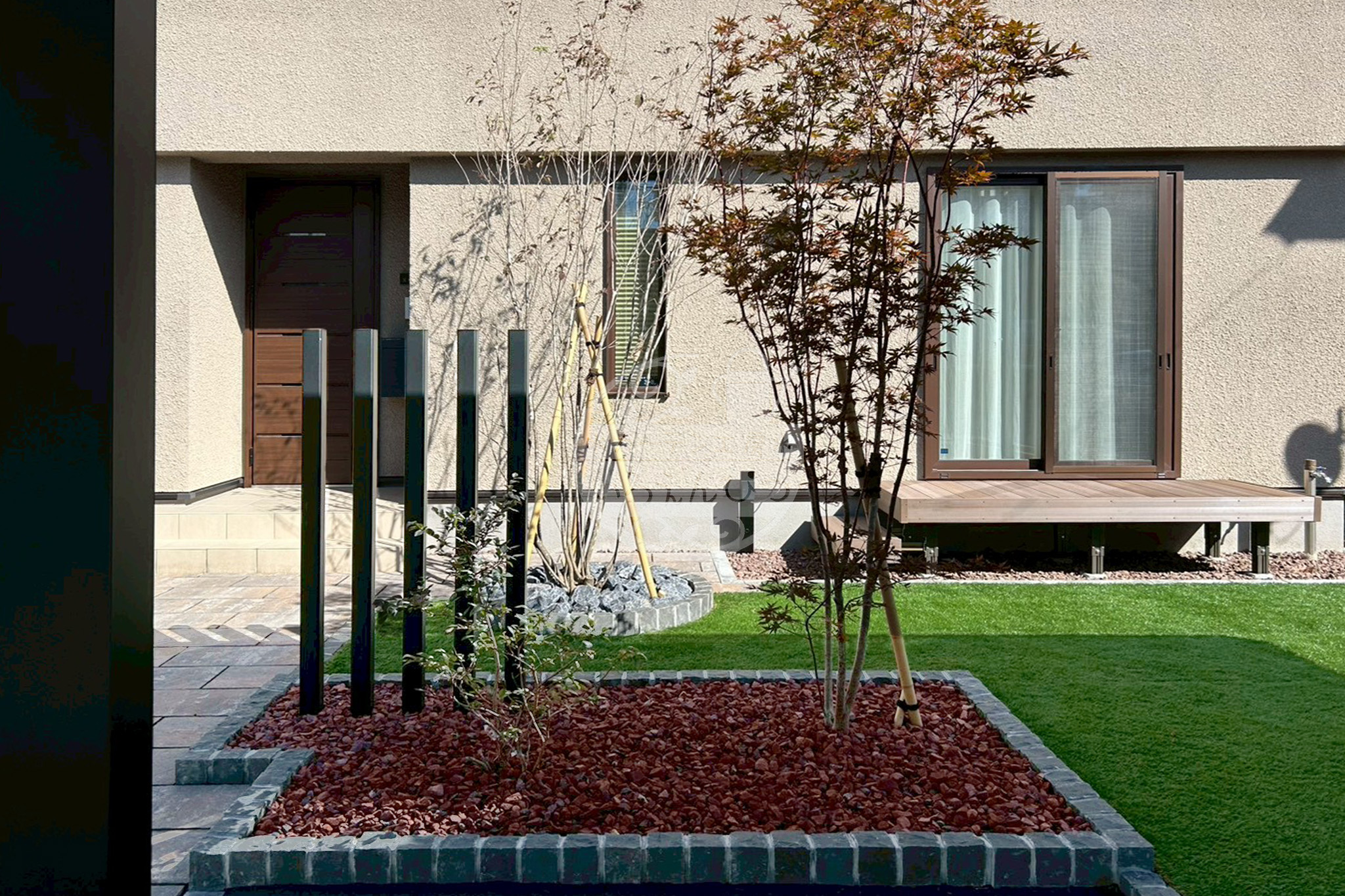 ご住居外壁の質感・色味、外観がとても素敵で、外構部全面にも建物の魅力的な雰囲気を広げたいというコンセプトの元でプランニングさせて頂きました。