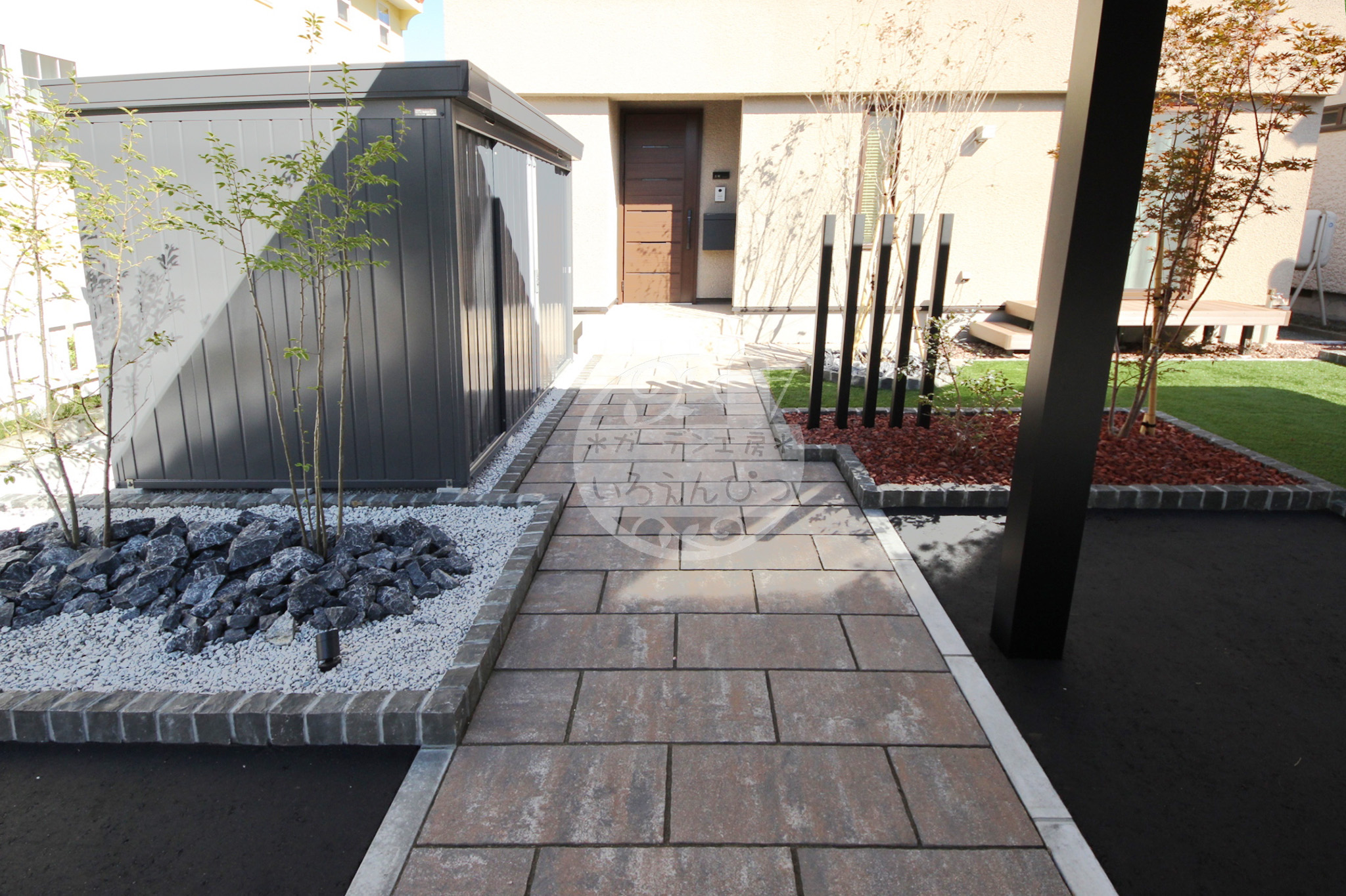 玄関まで10mを越えるアプローチを色ムラの美しいパエリア・ムエル色(エスビック製品)で単純になり過ぎないよう途中クランクを設けつつ大きさも統一しました。
